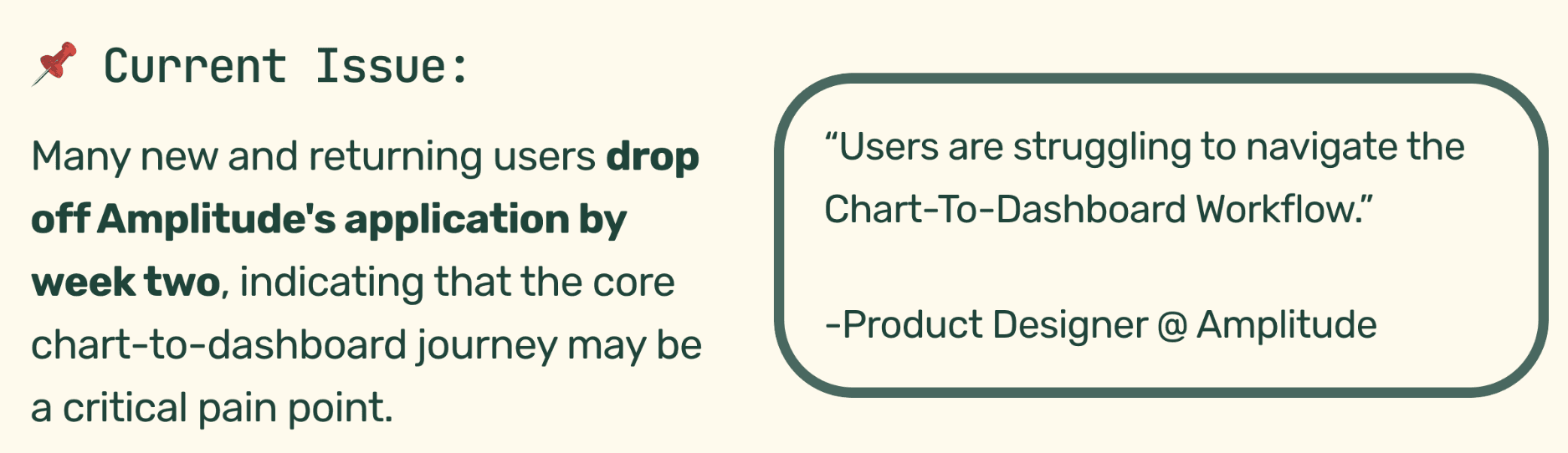 Amplitude's main target audience is their employees so I chose to assess the current dashboard-to-chart experience by user interviewing seven Amplitude employees with diverse job roles and work experience (new, junior, senior level).